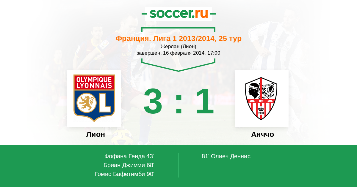 43' (1:0) Фофана Геида (6) (Ляказетт Александр (10))