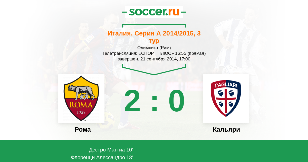 Запасные: 15 Пьянич Миралем (с 68'), 8 Льяич Адем (с 72'), 82 Эмануэльсон Урби (с 82'), 35 Торосидис Василис, 96 Санабрия Антонио, 50 Сомма Мишель, 10 Тотти Франческо, 91 Калабрези Артуро, 25 Холебас Хосе, 28 Скорупски Лукаш, 1 Лобонц Богдан, 32 Паредес Леандро