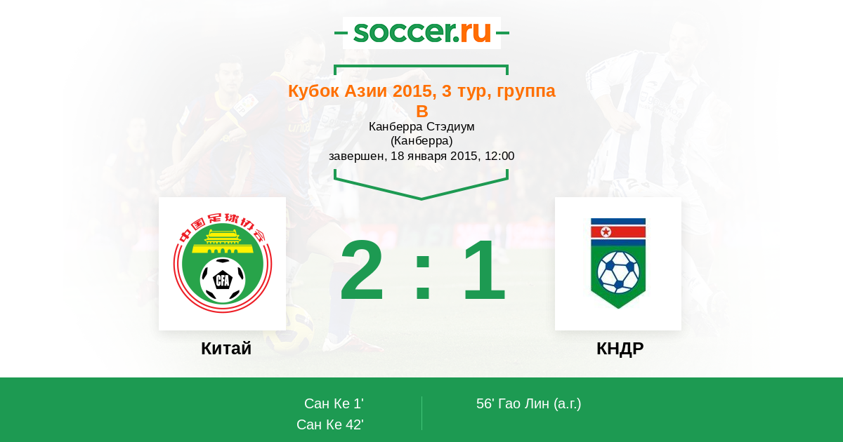 Запасные: 20 Ю Ханчао (с 53'), 15 У Си (с 70'), 6 Ли Анг (с 82'), 1 Цзэн Чэн, 7 Ву Лей, 9 Янг Сюй, 12 Ян Юнлинг, 13 Лю Джианье, 14 Джи Сянг, 19 Лю Бинбин, 22 Ляо Лишенг