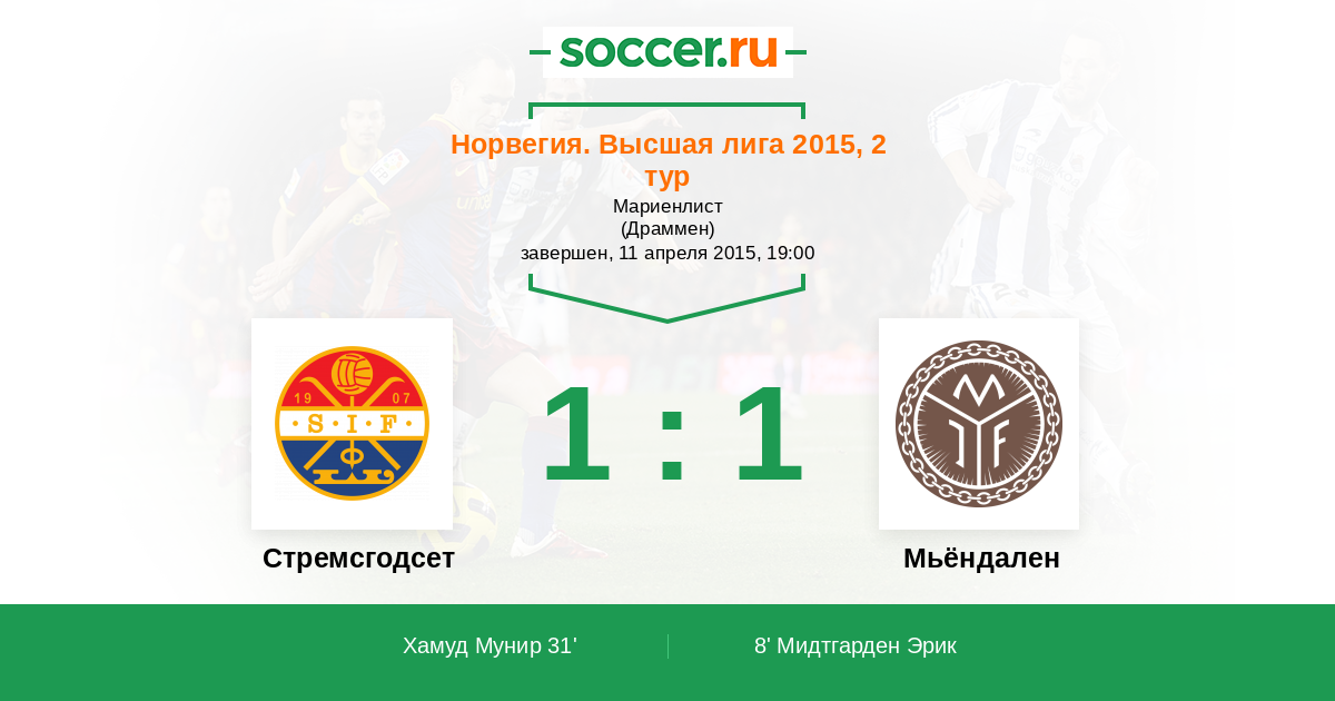 8' (0:1) Мидтгарден Эрик (10) (Сундли Мортен (22))