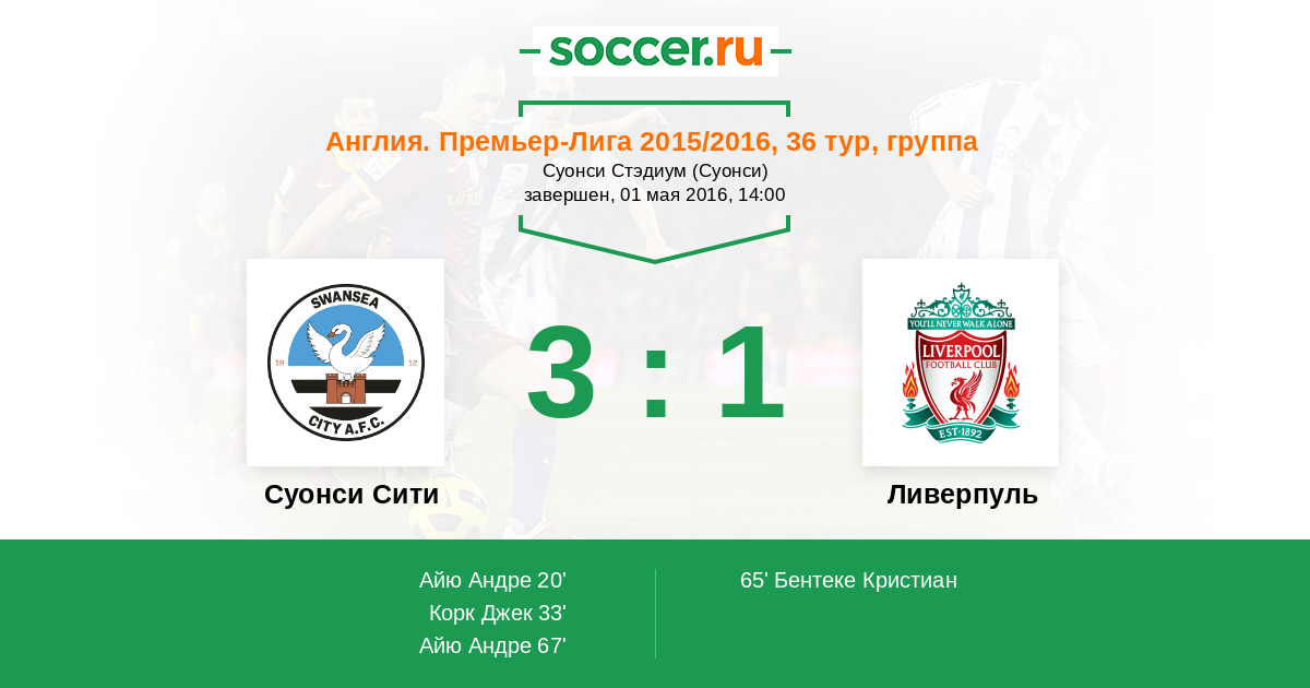 20' (1:0) Айю Андре (10) (Сигурдссон Гильфи (23))