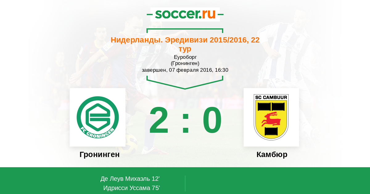 12' (1:0) Де Леув Михаэль (8) (Линссен Брайан (11))