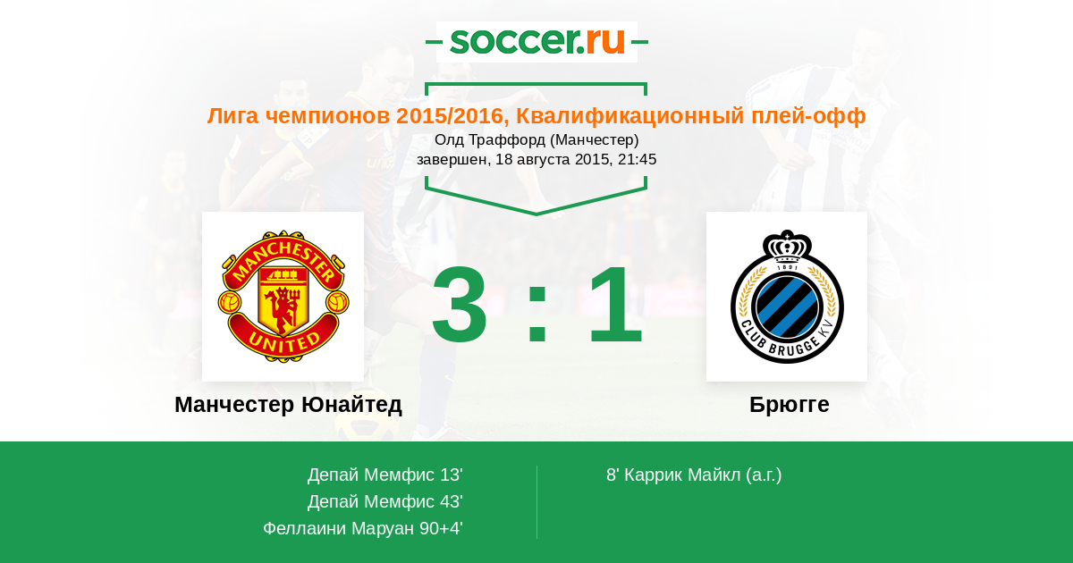 8' (0:1) Автогол Каррик Майкл (16)