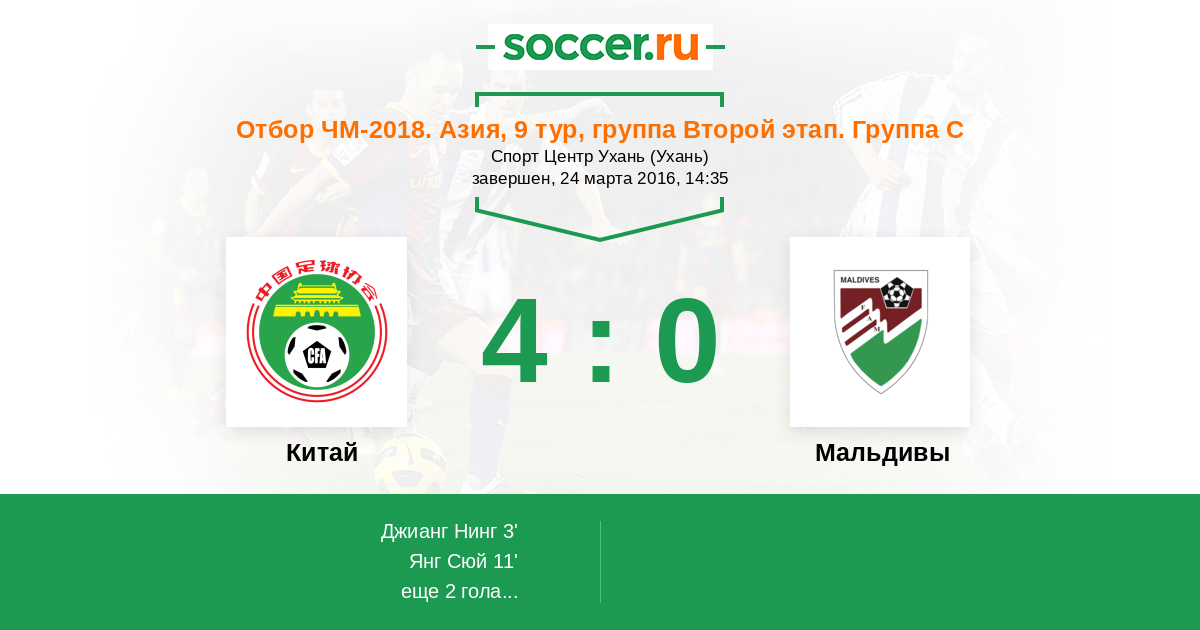 Запасные: Гао Лин (с 22'), Хуанг Бовэн (с 45'), Ю Дабао (с 64'), Ду Вэй, Ли Анг, Цай Хуэйканг, Чжанг Сиджэ, Ян Юнлинг, Динг Хайфэнг, Инь Хонгбо, Чэндун Чжан, Ванг Далей