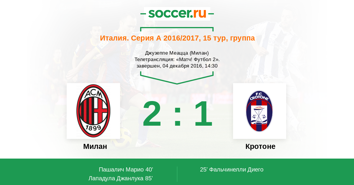 Милан, Джузеппе Меацца Телетрансляция: "Матч! Футбол 2".