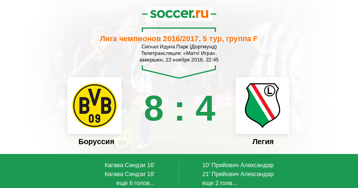 Поляки конечно приятно удивили в домашнем поединке против «Реала», но скорее всего это было минутным всплеском и недооценкой со стороны Мадрида, все-таки по подбору игроков «Легия» заметно уступает всем оппонентам. Считаю, что шансов у команды Яцека Магейры практически нет, даже без сломавшего руку голкипера Бюрки дортмундцы должны легко набирать три очка.