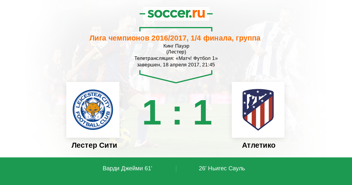 Я думаю Лестеру нужно сыграть лучший матч в сезоне,а Атлетико худший чтобы англичане прошли дальше! У Атлетов великолепная защита! Да и забить могут кому угодно и где угодно! Думаю будет ничья ,0:0,1:1!