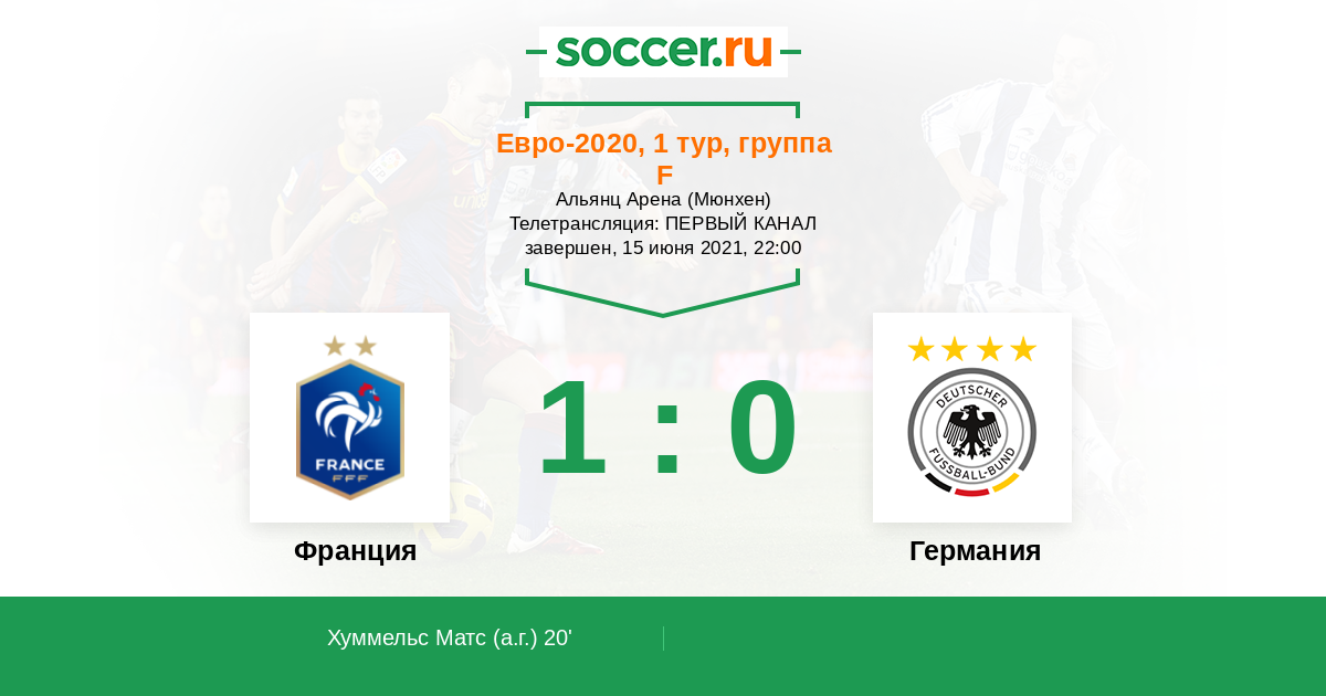 Германия перестаёт быть Бундесмашиной. За весь матч ни одного по сути голевого момента не создать. Французы смотрелись на их Мюнхен арене куда солиднее и победа им досталась заслуженно.