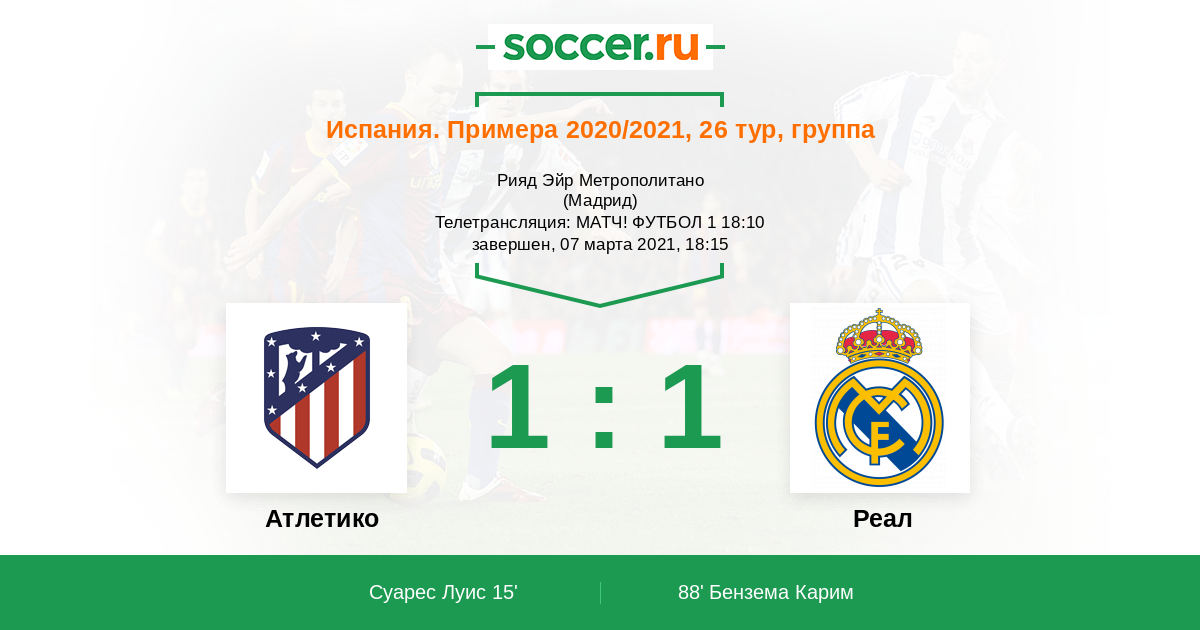 Мадрид, Рияд Эйр Метрополитано Телетрансляция: МАТЧ! ФУТБОЛ 1 18:10