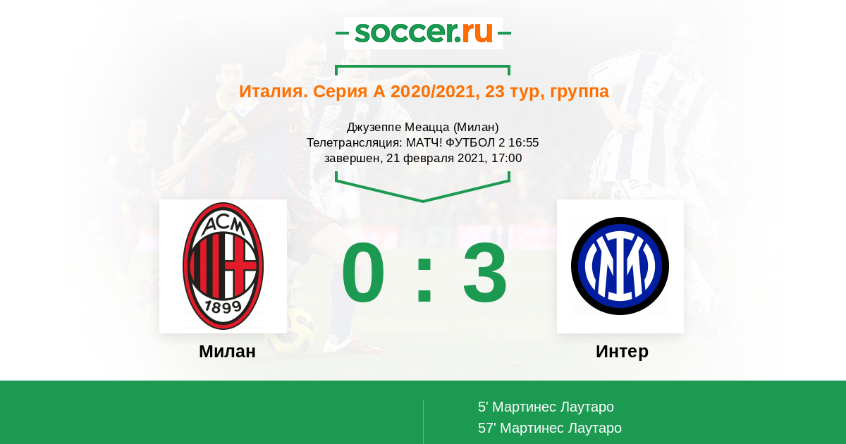 Милан, Джузеппе Меацца Телетрансляция: МАТЧ! ФУТБОЛ 2 16:55