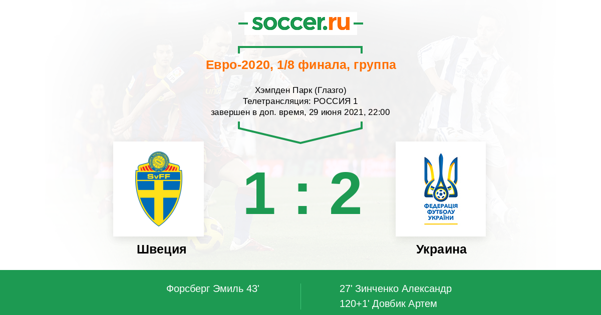 Поздравления сборной Украине по футболу с замечательной игрой против сборной Швеции и с победой в которой каждый игрок команды внёс свой вклад в этот изнурительный и изматывающий матч, который получился тяжёлым для обеих команд. Но за счёт невероятных усилий и силы воли игроки команды Украины смогли вырвать в конце дополнительного времени победу которая стала исторической в истории футбола сборной на Чемпионатах Европы. Всем игрокам кто выходил на поле в этот вечер и отыграл этот тяжёлый матч Респект и Уважение, Удачи в следующих игре.