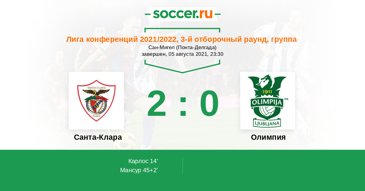 Очевидно, словенский клуб смотрится скромней португальского, это доказывают и результаты матчей квалификации. “Санта Клара” одержала две победы с общим счетом 5:0, а “Олимпия” прошла стадию четвертьфинала выиграв с минимальным счетом и сыграв вничью - 1:1. Португальцы дома должны уверенно обыгрывать словенский клуб