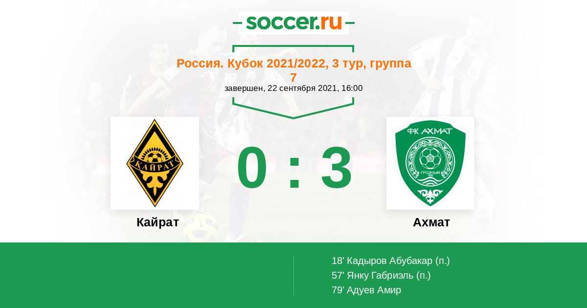 Матч между командами Кайрат и Ахмат должен порадовать голами, для Ахмата участие в Кубке России это возможность выиграть трофей так как в чемпионате добиться на данный момент команде будет не реально исходя от состава игроков. Поэтому прогноз на этот матч, победа гостей и европейский гандикап гостей (1:0). Удачи