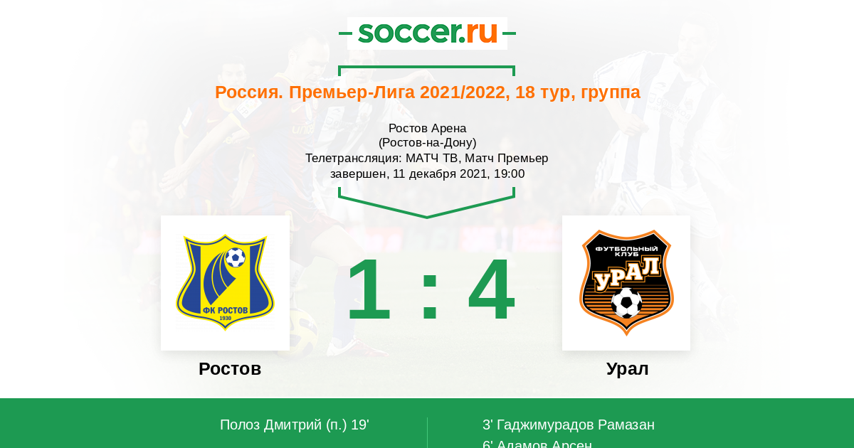 Ростов-на-Дону, Ростов Арена, зрителей: 5255 Телетрансляция: МАТЧ ТВ, Матч Премьер