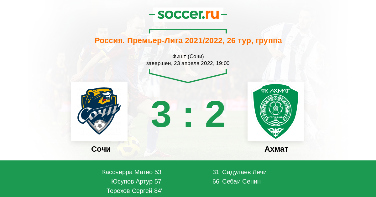 Сочинцы пребывают в неплохой форме, а «Ахмат» в свою очередь пребывает в кризисе, проиграв три из четырех последних игр. Да и к тому же «барсы» очень удачно играют против грозненцев в последнее время.