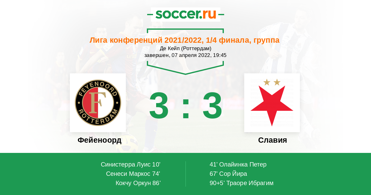 Этот матч для обеих команд в Лиги Конференций в четвертьфинале является —исторический. "Фейеноорд" двадцать лет не доходил до этой стадии еврокубков, а "Славия" вообще впервые в истории смогла зайти так далеко, и разумеется, обе команды настроены развить этот успех. Обе команды играют весьма результативно, соответственно матч обещает выйти зрелищным и порадовать болельщиков забитыми голами. Удачи