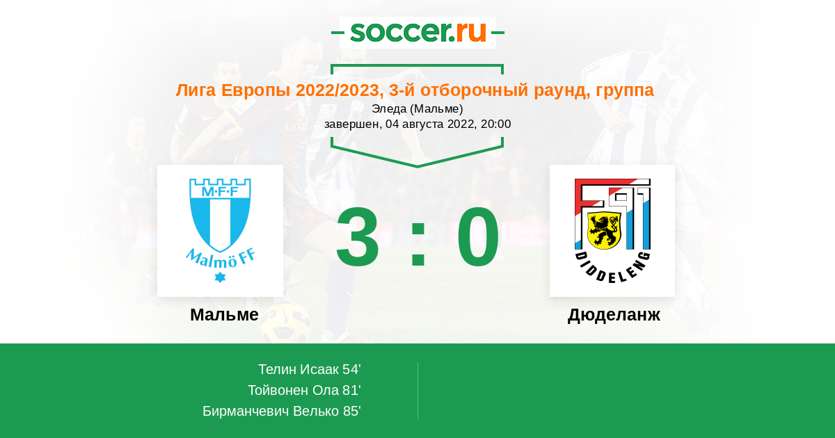 Шведский Мальме, который в европейских кубках далеко не новичок встречается с люксембургской командой Дюделанж. Чего тут ждать? Конечно же разгрома гостей. Не ссильно крупно, но все же с крупным счётом 3-0.