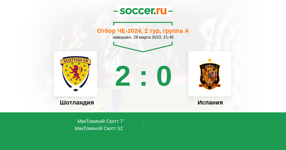 В первом туре квалификации к Евро-2024 сборная Шотландии не испытала проблем в домашнем матче против скромного Кипра, обыграв соперника 3-0. Однако даже островитянам два из трёх мячей британцы забили в самой концовке встречи. Испания - это соперник гораздо другого уровня. В данной ситуации вообще не думаю, что шотландцы поразят чужие ворота хотя бы раз.