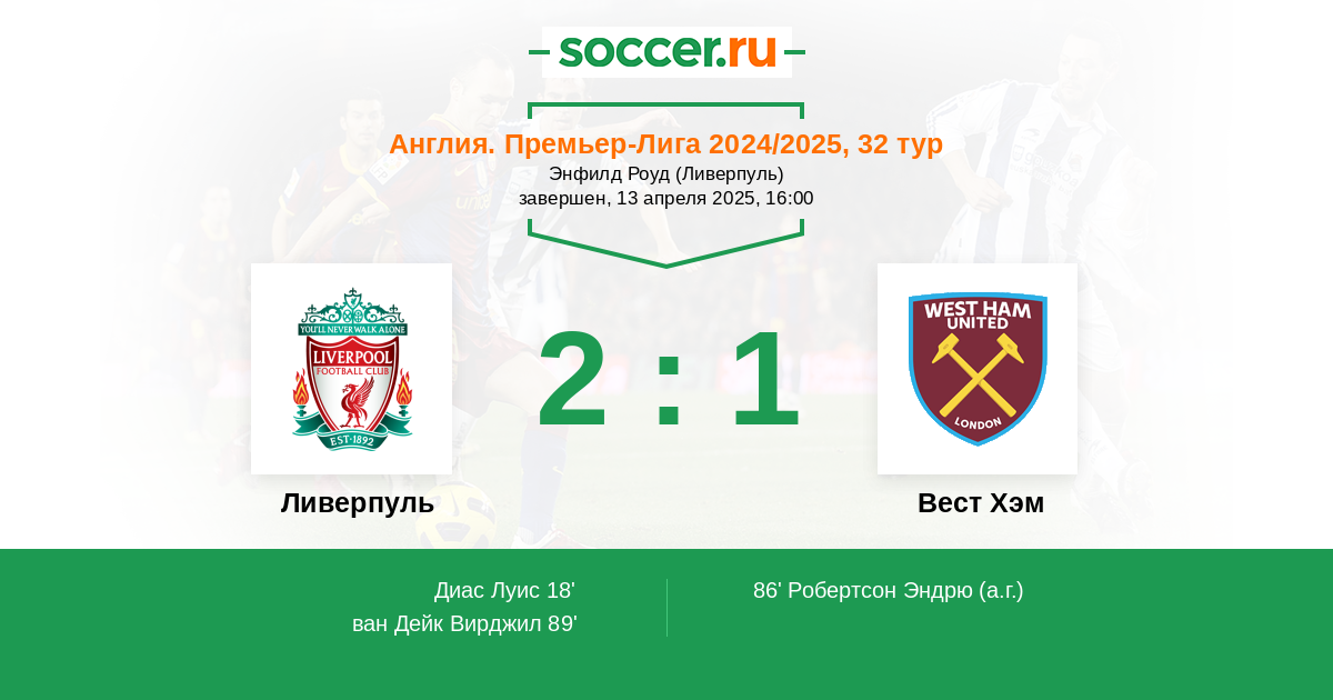 История встреч на "Энфилде" также не на стороне гостей — лишь одна победа в 57 визитах. На фоне слабой выездной формы "Вест Хэма" и статистического доминирования "Ливерпуля", хозяева выглядят явными фаворитами.