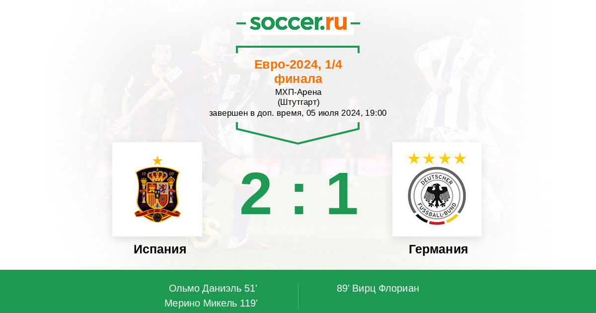 Молодцы Испанцы сил отдали много но иначе никак если хочешь в финал! Немцы прошли Данию на тоненького, а вот с испанцами скрылись проблемы, слабый центр поля, сырой в центре нападения Хаверц, очень много упустил моментов в которых мог решить судьбу встречи, рюдюгер наелся надо было менять, на прямых ногах ходил, куда смотрел Нигельсман, а вот испанский тренер этим воспользовался и замены сработалали, Ольмо о красавец МОРАТАта в глубине но очень помогал, защита образцовая, пропустили лишь потому-что уступили в росте в голевом эпизоде а так подарком испанцев от вратаря немцы не воспользовались не забиваешь ты, забивают тебе! Судья черт английский, 2 минуты переиграли Карвахаля удалил, Кроссу за эпизод с Педри пожалел за толчок не удалил за удар не удалил, что хотел Кросс то и делал, в общем не лучшее судей тво такого матча. Испания с победой, а Нигельсману ещё учиться и учиться справились с флангами а создали немцы много только в концовке матча хоть что то, и то это было на эмоциях, рано его хвалить, игру не провалил но испанцев скрыть не смог помог навал ! Испания физически порадовала не уступили немцами почти не в чем игра равная но испанцы поинтереснее и играли не так грязно как немцы один кросс чего стоит и Химик не лучше голову чуть не снёс защитнику костоломы хреновы... Испанию жду в финале!