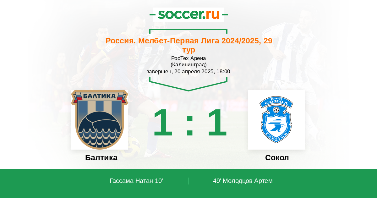 В матче двадцать девятого тура российской Мелбет Первой Лиги встречаются комадны с первого и последнего мест, казалось бы всё предрешено, лидеры таблицы легко разберутся с гостями, но в матчах этих команд редко бывало больше 2 голов и Балтике традиционно непросто играть с Соколом. Рискну предположить что в этот раз хозяевам удастся победить, но с минимальным счётом