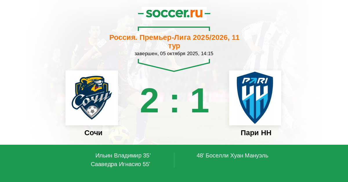 Ниже Нижнего Новгорода только Сочи, ниже Сочи находится дно. Если это дно пробить покажется первая лига. В РПЛ желающих туда попасть нет. Сочи пытается играть в футбол, но тяжело набирает очки. В этот раз у южных всё получится. Победа хозяев.