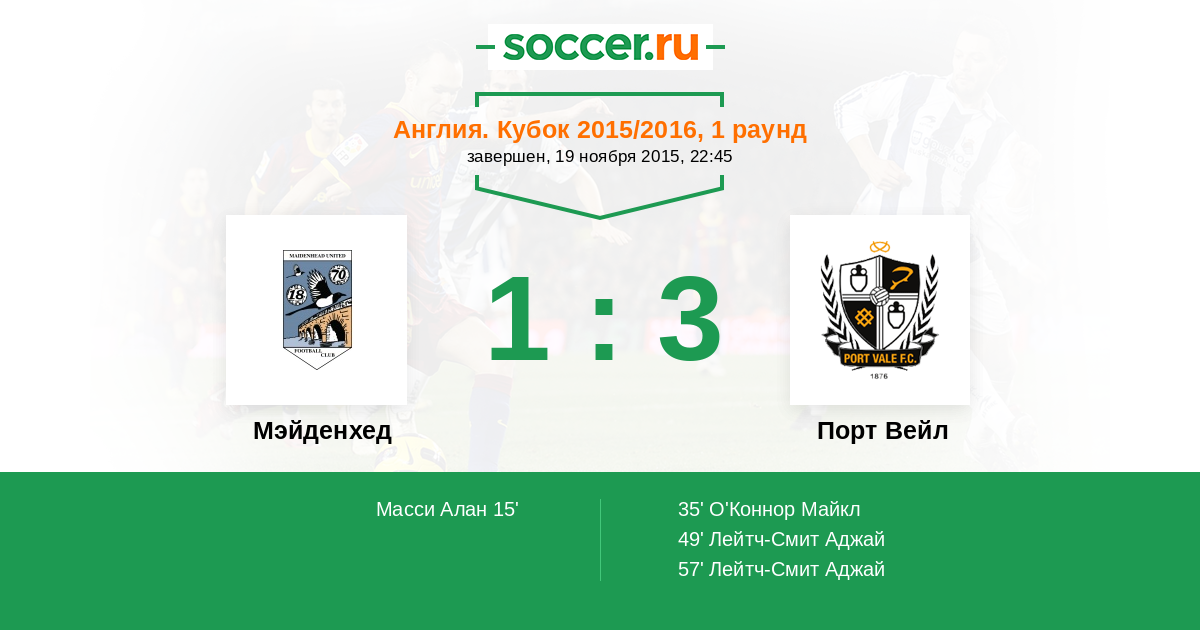 15' ГолЛоготип МэйденхедМасси Алан (5) - 1:0