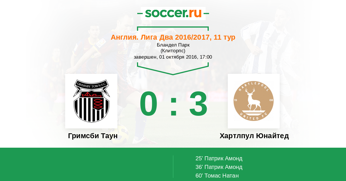 25' ГолЛоготип Хартлпул ЮнайтедПатрик Амонд (9) - 0:1