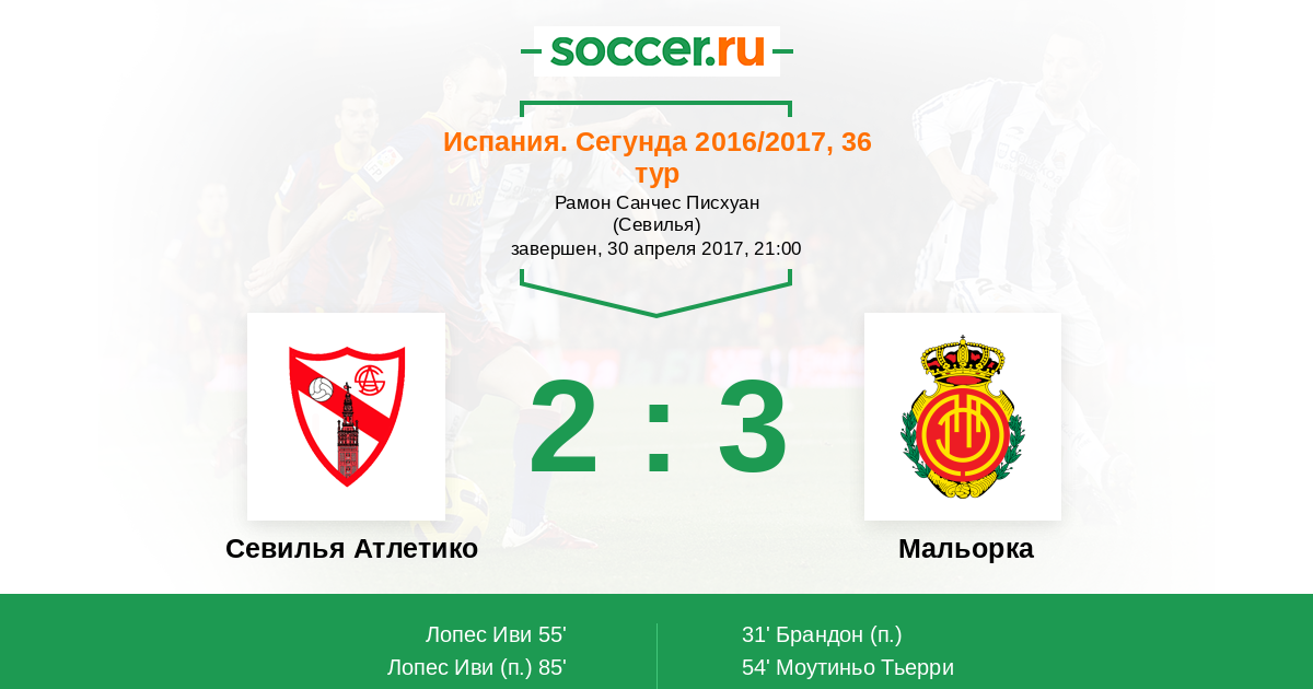 55' ГолЛоготип Севилья АтлетикоЛопес Иви (11) (M. Gual) - 1:2