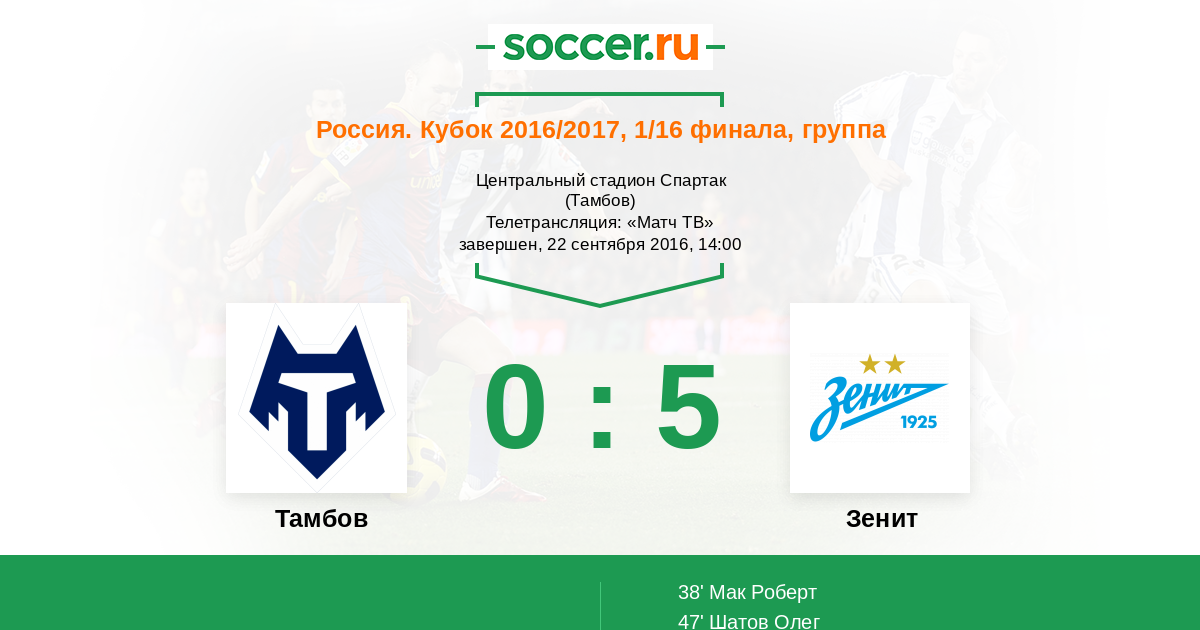 Все! Матч завершен! Ничего не добавляет ко второму тайму главный арбитр матча. Питерский "Зенит" добывает легкую победу над "Тамбовом" со счетом 5:0. "Горожане" в первом тайме смотрелись довольно неплохо на фоне именитого соперника, однако первый пропущенный гол существенно подкосил команду. Предлагаем также выбрать лучших игроков в составах обеих команд. Для Вас эту онлайн-трансляцию провел Андрей Бабенчук. Оставайтесь на http://www.soccer.ru/ !