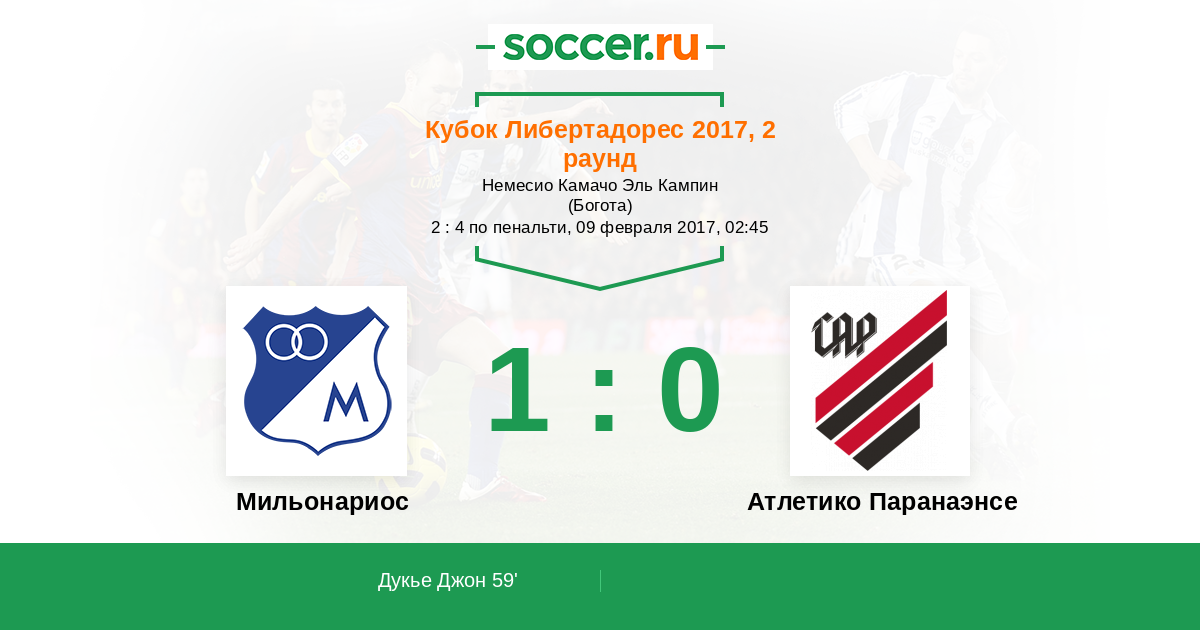 59' ГолЛоготип МильонариосДукье Джон (22) - 1:0
