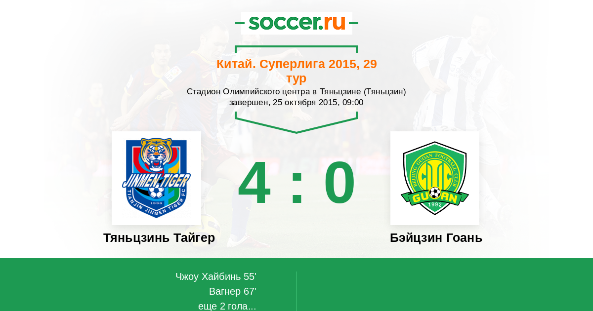67' ГолЛоготип Тяньцзинь ТайгерВагнер (32) (Логотип Тяньцзинь ТайгерБаркос Эрнан (9)) - 2:0