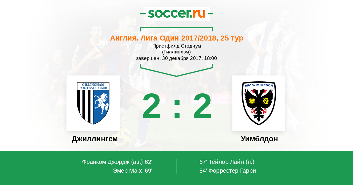 69' ГолЛоготип ДжиллингемЭмер Макс (5) (Логотип ДжиллингемКларе Шон (28)) - 2:1