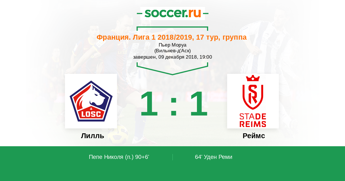 64' ГолЛоготип РеймсУден Реми (18, в) (Логотип РеймсРомао Алексис (4, п)) - 0:1