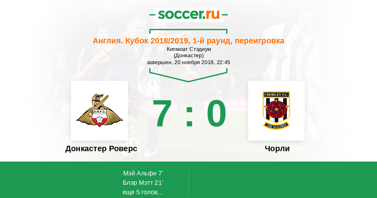7' ГолЛоготип Донкастер РоверсМэй Альфи (19) (Логотип Донкастер РоверсКейн Херби (15)) - 1:0