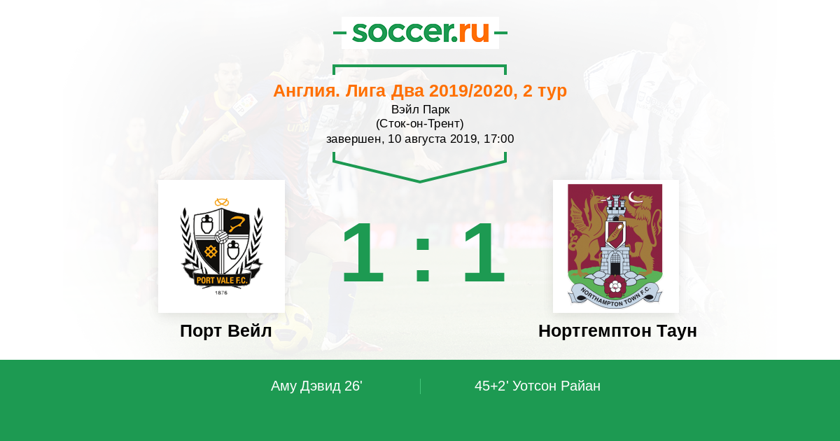 45+2' ГолЛоготип Нортгемптон ТаунУотсон Райан (8) - 1:1