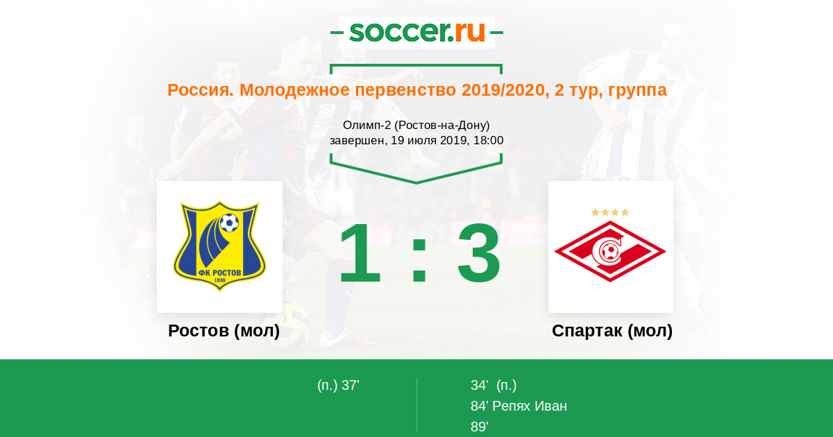 34' Гол с пенальтиЛоготип Спартак (мол)M. Kalachevskii - 0:1 (П)