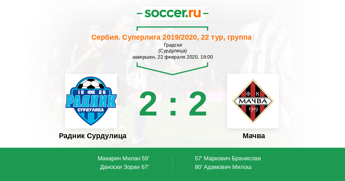 59' ГолЛоготип Радник СурдулицаМакарич Милан (P. Djordjevic) - 1:1