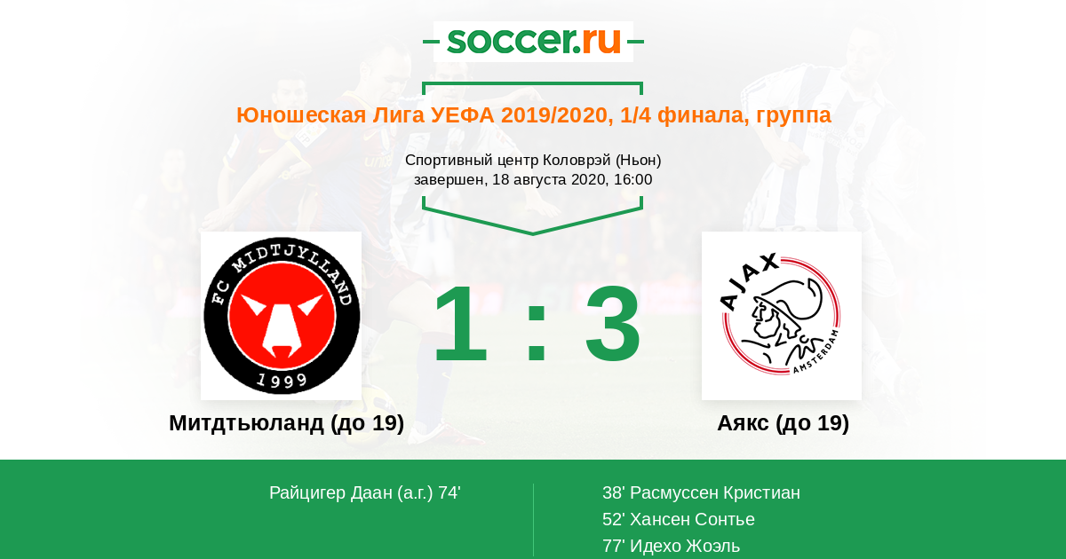 74' АвтоголЛоготип Аякс (до 19)Райцигер Даан (1) - 1:2 (А)
