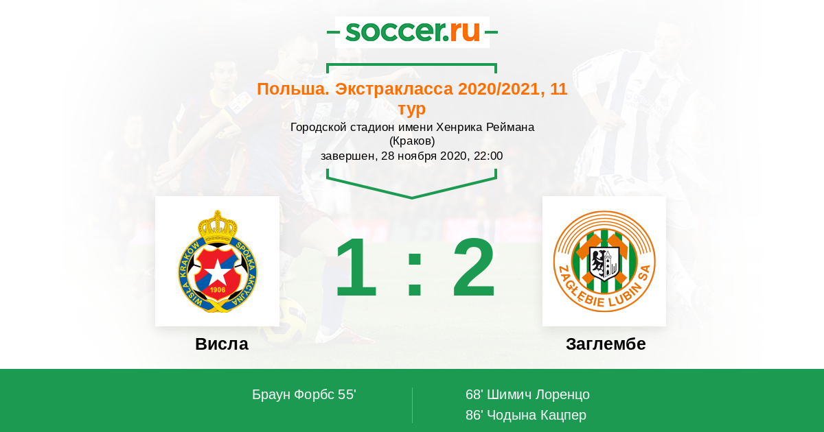 55' ГолЛоготип ВислаБраун Форбс (99, п) (Логотип ВислаКарлос Жан (15, п)) - 1:0