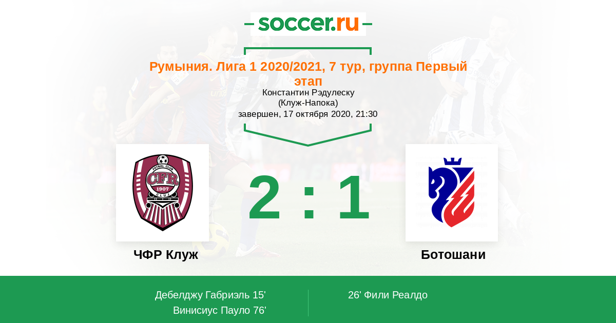 15' ГолЛоготип ЧФР КлужДебелджу Габриэль (22, н) (Логотип ЧФР КлужКамора (45, з)) - 1:0