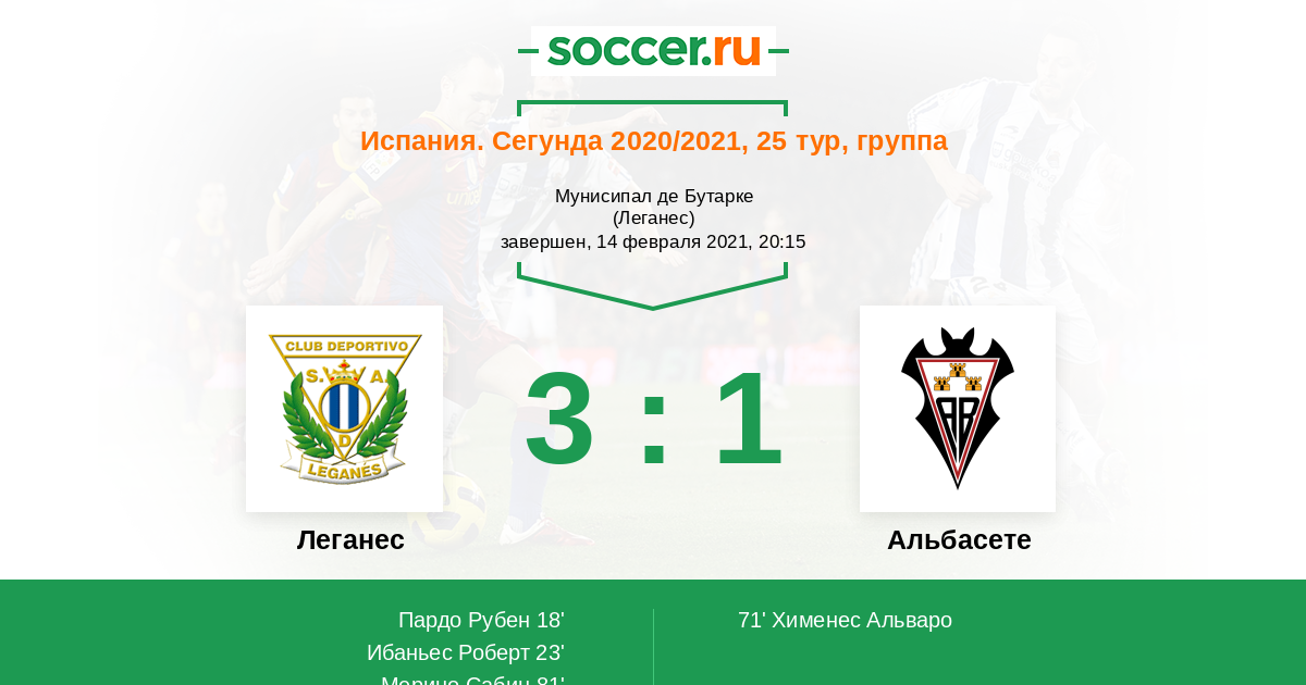 18' ГолЛоготип ЛеганесПардо Рубен (25, п) - 1:0