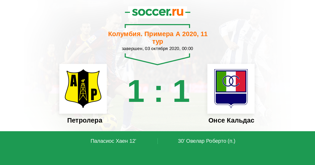 30' Гол с пенальтиЛоготип Онсе КальдасОвелар Роберто (11) - 1:1 (П)