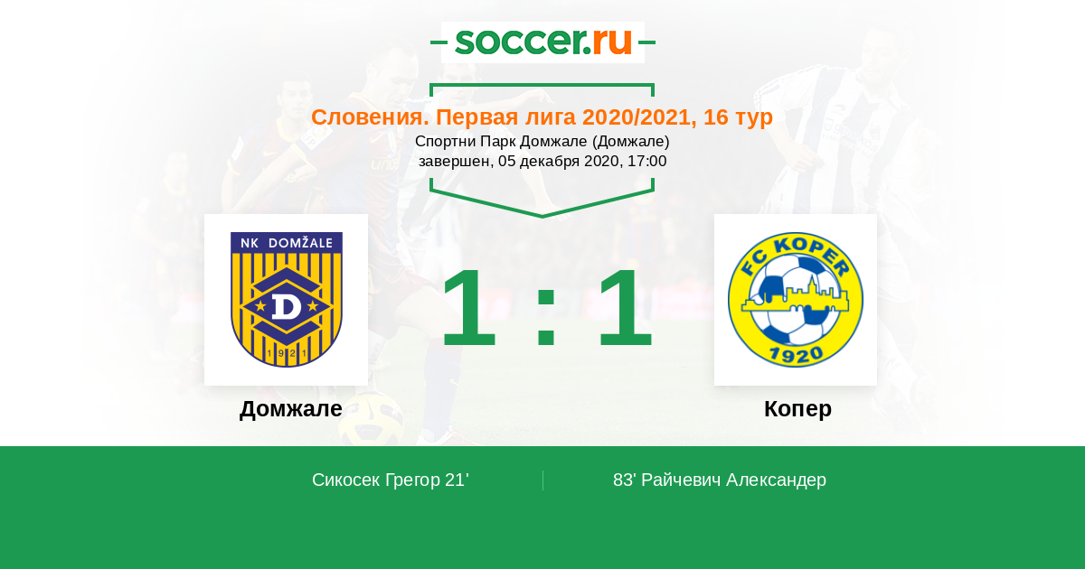 21' ГолЛоготип ДомжалеСикосек Грегор (12, з) - 1:0