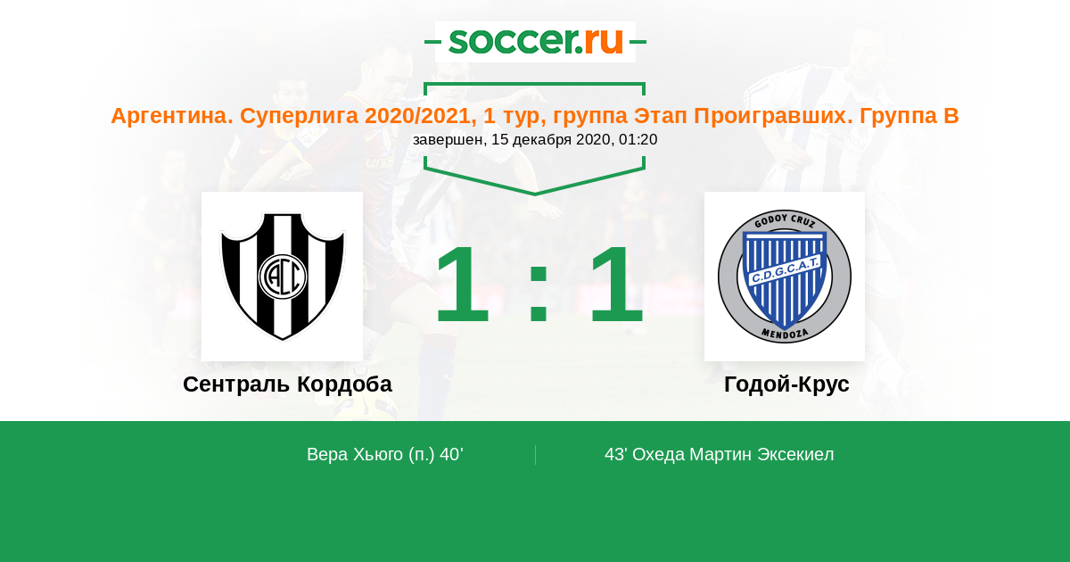 40' Гол с пенальтиЛоготип Сентраль КордобаВера Хьюго (24) - 1:0 (П)