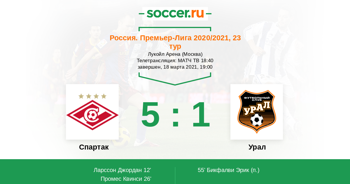 всех КБ с победой! Ларссон просто вышел на новый уровень, похоже за Джорданом уже этим летом начнётся охота из клубов топ -5 европейских чемпионатов. рано или позно Ибрагимович снова будет играть в паре нападения за сборную Швеции с Ларссоном. оба гола Джордана просто на загляденье...Промес просто вернулся править и сделал разницу при счёте 1-0, когда урал ещё надеядся что-то противопоставить Спартаку, как же нам не хватало Антохи!!! явный лидер команды. Крал до травмы забирал все спорные мячи, игроки урала не успевали поднять глаза и подумать о своей атаки как игрок сборной Чехии накрывал все их попытки в зародыше ( надеюсь наших молодых звёзд удасться удержать в Спартаке хотя бы ещё на один сезон, на Ларссона и Крала будет большой спрос после евро 2021) Зобнин молодцом, Соболев стабильно уже на высоком уровне, Жиго и Аиртон сыграли отличную игру, продолжаем гонку как минимум за лигу чемпионов. вперёд Спартак!!!