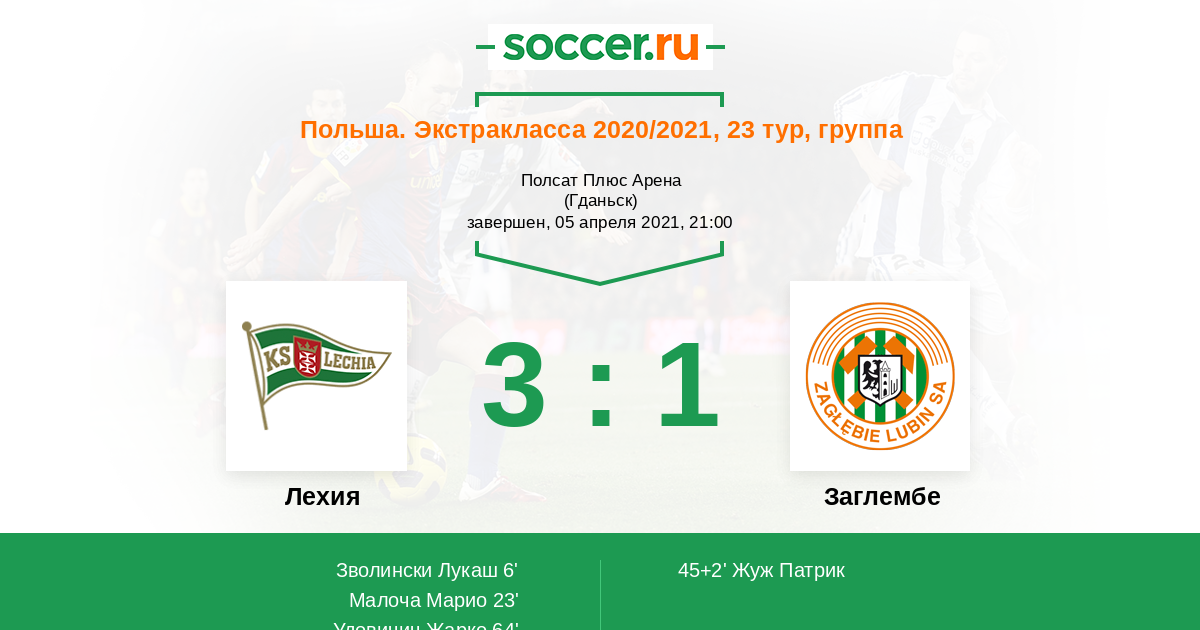 45+2' ГолЛоготип ЗаглембеЖуж Патрик (17, п) (Логотип ЗаглембеБалич Саша (3, з)) - 2:1