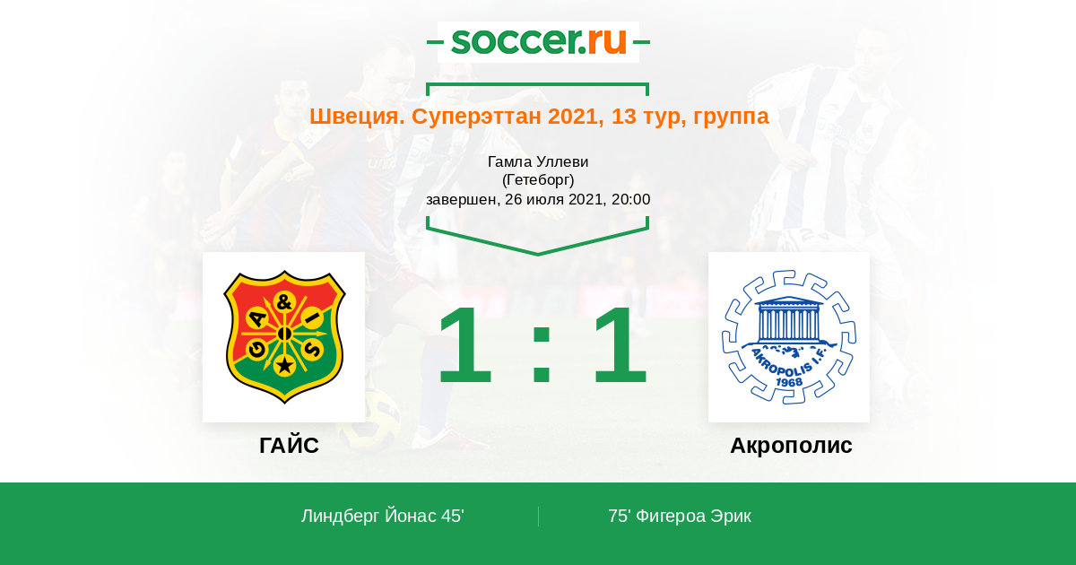 45' ГолЛоготип ГАЙСЛиндберг Йонас (25, п) - 1:0