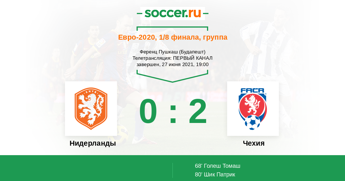 Для Голландии все повторилось как и на ЕВРО-2008! Такая же уверенная игра в группе и полный оптимизм в преддверии матча с не самым топовым соперником, а в итоге снова поражение) И тогда в Базеле тоже голландских болельщиков было в большинстве, как и в Будапеште. Чехи - красавцы! Ну а Шик реально замахнулся на бомбардирский рекорд Бароша образца ЕВРО-2004. С заслуженной победой, Чехия!