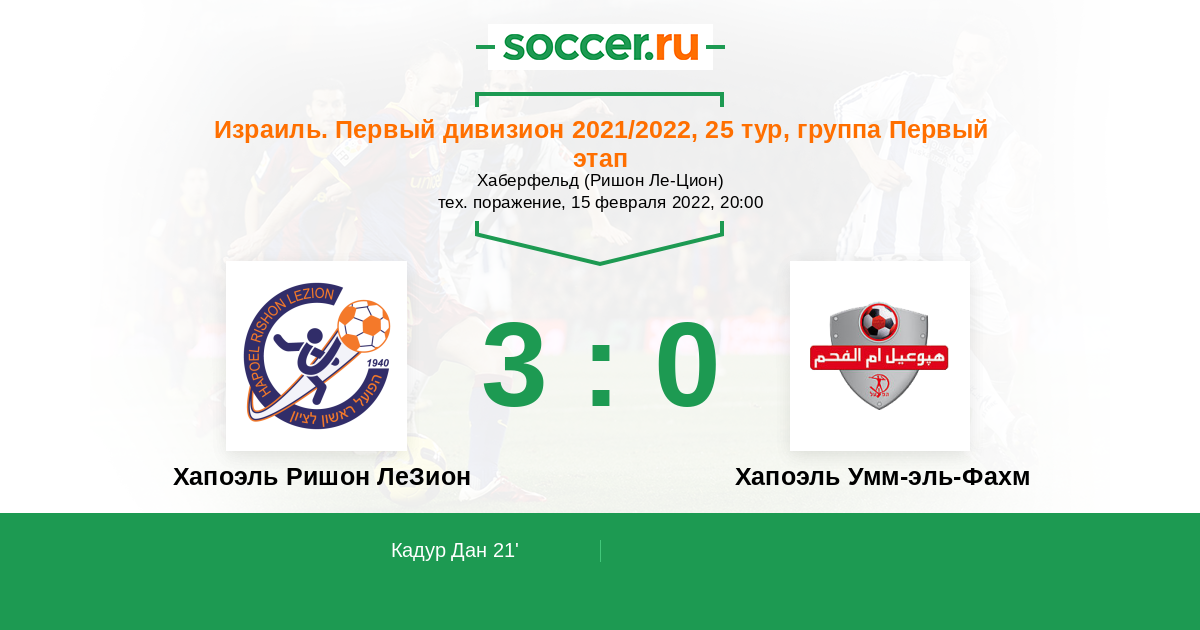 21' ГолЛоготип Хапоэль Ришон ЛеЗионКадур Дан - 1:0